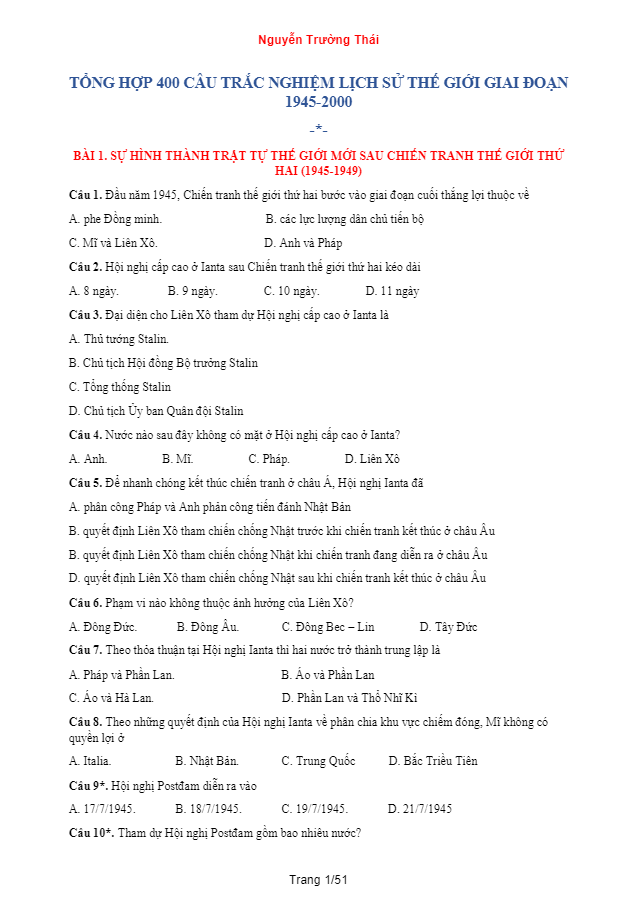 TỔNG KẾT LỊCH SỬ THẾ GIỚI HIỆN ĐẠI TỪ SAU CHIẾN TRANH THẾ GIỚI THỨ HAI ĐẾN NĂM 2000.