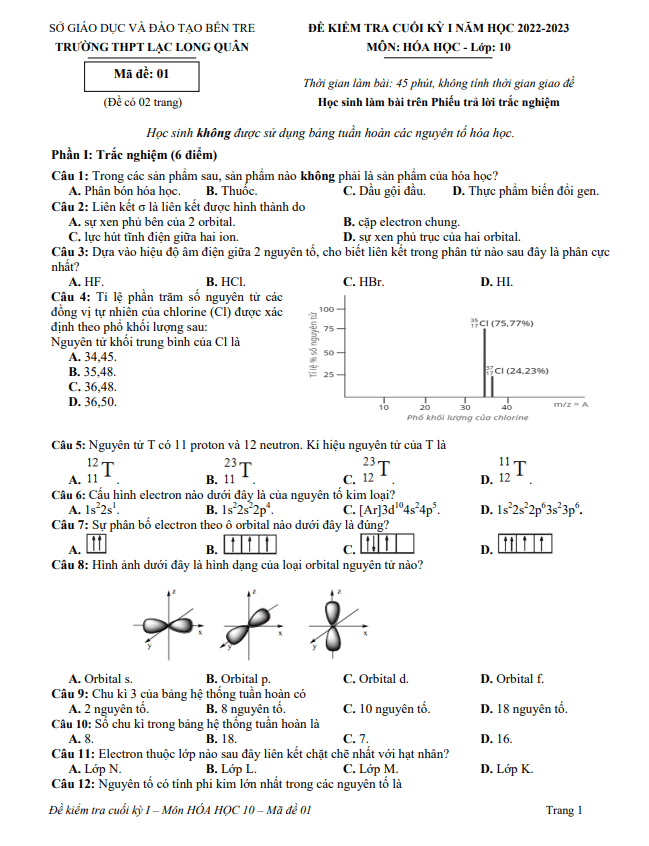 Đề cuối kỳ 1 Hóa học 10 năm 2022 – 2023 trường THPT Lạc Long Quân – Bến Tre