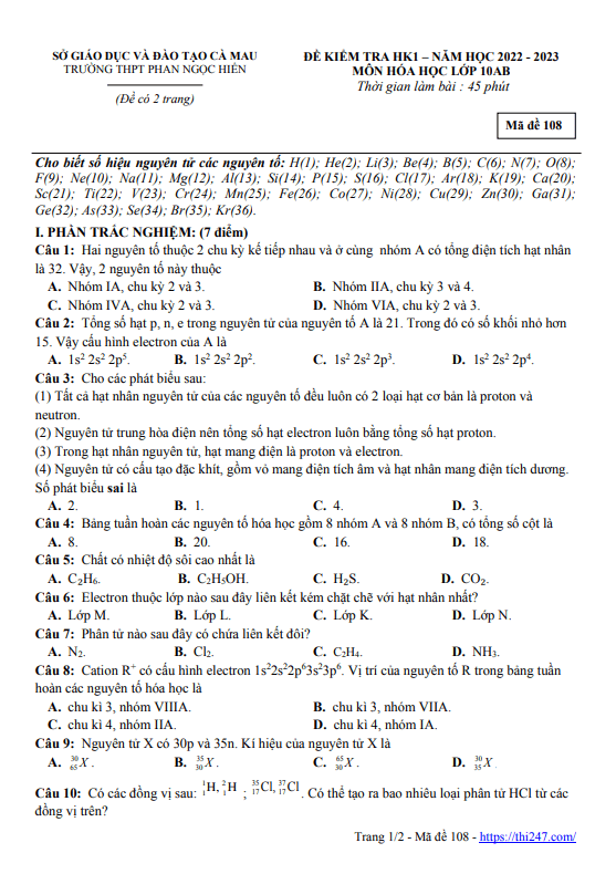 Đề thi HK1 Hóa học 10 năm 2022 – 2023 trường THPT Phan Ngọc Hiển – Cà Mau