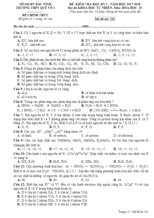 Đề kiểm tra học kỳ 1 Hóa học 10 năm 2017 – 2018 trường THPT Quế Võ 1 – Bắc Ninh