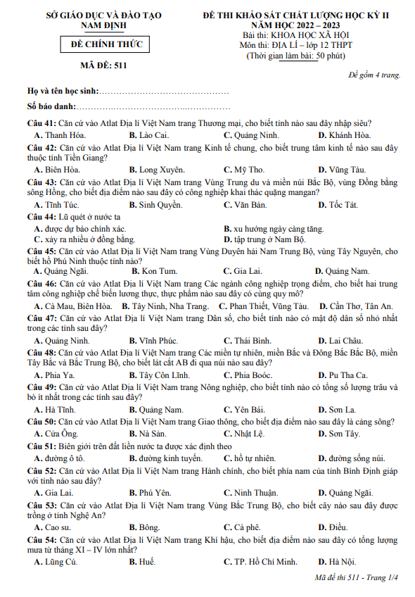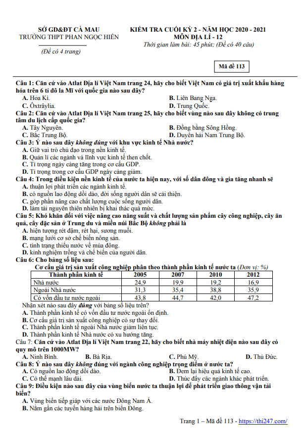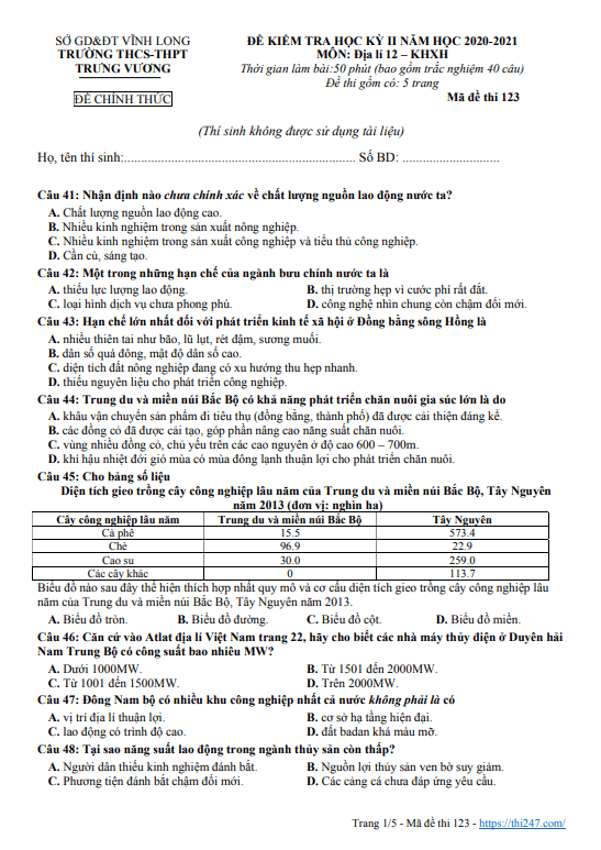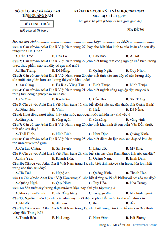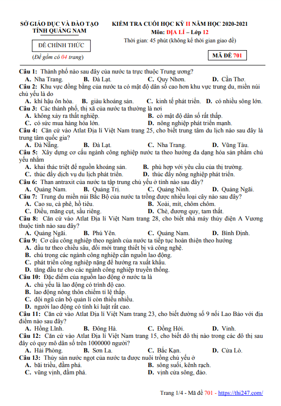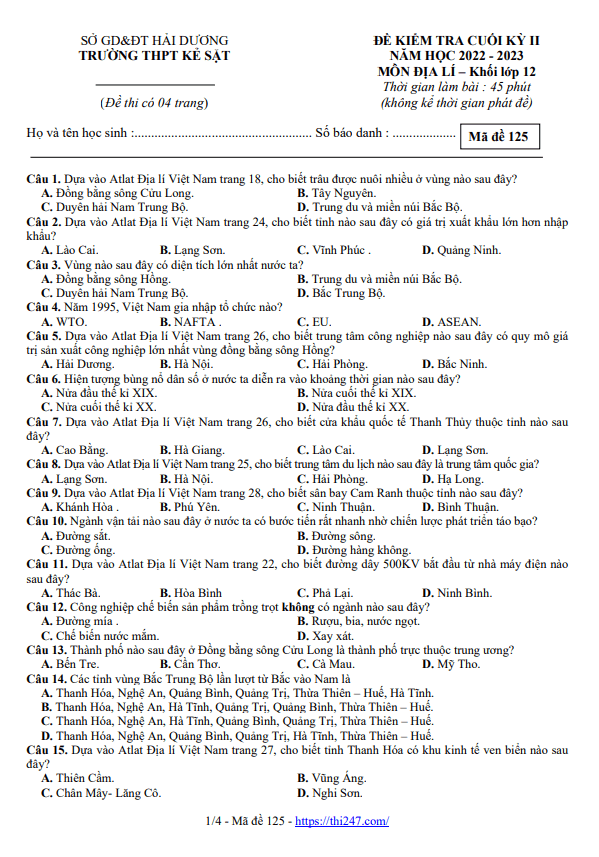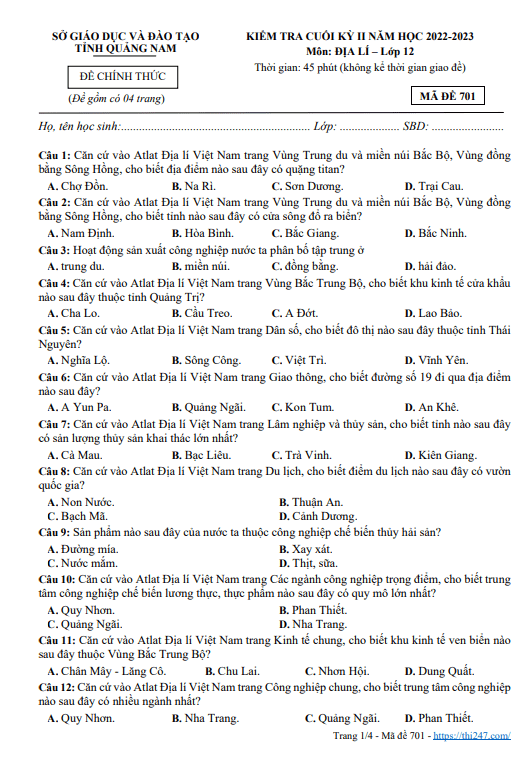 Quý thầy, cô giáo và các em học sinh có thể xem và tải xuống miễn phí các đề thi HK2 Địa lý 12 (học kỳ 2 Địa lý 12) được chia sẻ trên THI247.com.