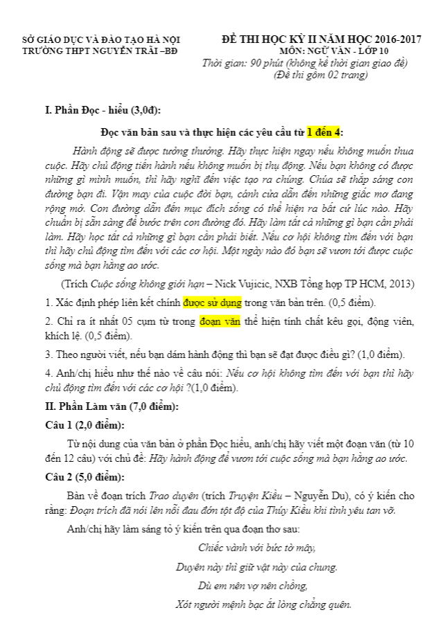 Quý thầy, cô giáo và các em học sinh có thể xem và tải xuống miễn phí các đề thi HK2 Ngữ Văn 10 (học kỳ 2 Ngữ Văn 10) được chia sẻ trên THI247.com.