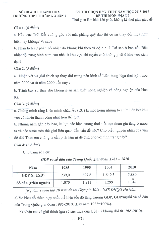 Đề thi chọn HSG Địa lý năm 2018 – 2019 trường Thường Xuân 2 – Thanh Hóa