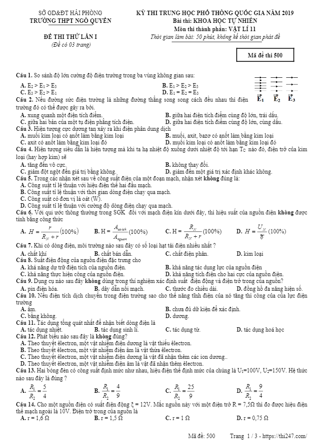 Đề thi thử Vật lý 11 THPTQG 2019 trường THPT Ngô Quyền – Hải Phòng lần 1