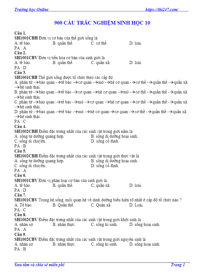Quý thầy, cô giáo và các em học sinh khối 10 có thể xem và tải xuống miễn phí các tài liệu Sinh học 10 được chia sẻ trên THI247.com.