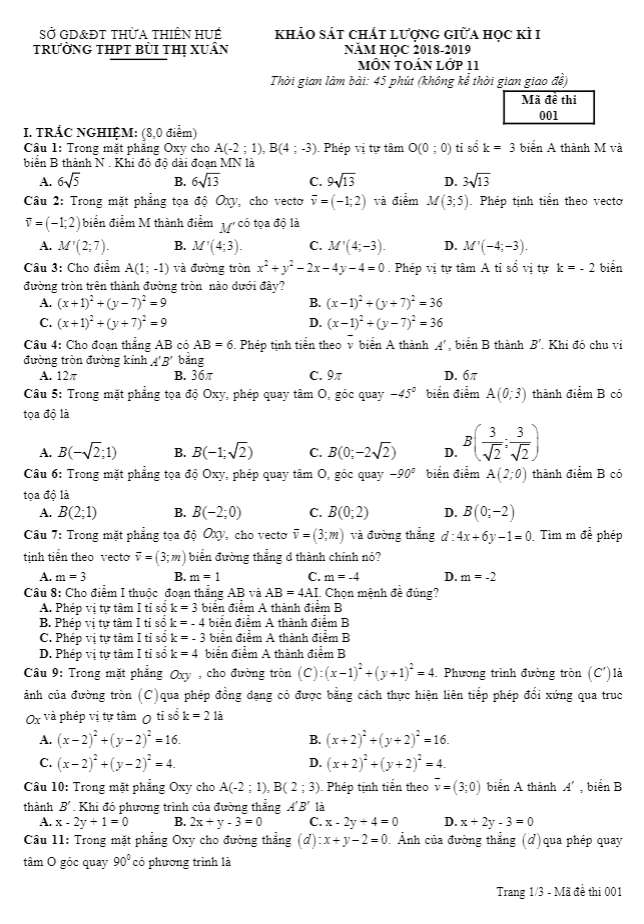 Đề KSCL giữa HK1 Toán 11 năm học 2018 – 2019 trường Bùi Thị Xuân – TT. Huế