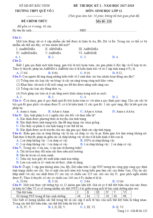 Đề thi học kỳ 2 Sinh học 12 năm 2017 – 2018 trường THPT Quế Võ 1 – Bắc Ninh