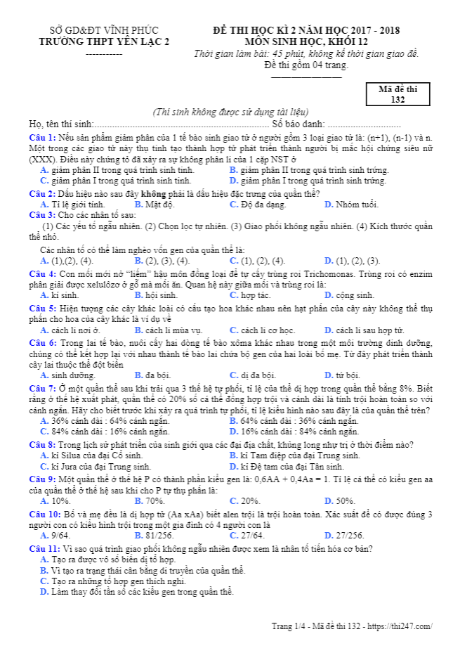 Đề thi HK2 Sinh học 12 năm 2017 – 2018 trường Yên Lạc 2 – Vĩnh Phúc