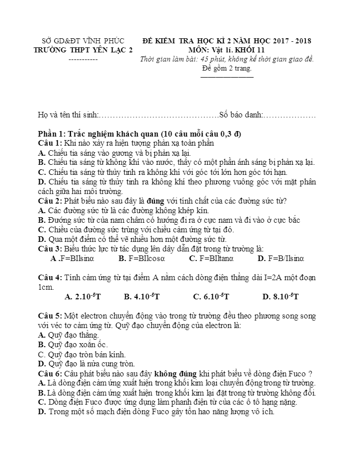 Đề thi HK2 Vật lý 11 năm 2017 – 2018 trường Yên Lạc 2 – Vĩnh Phúc