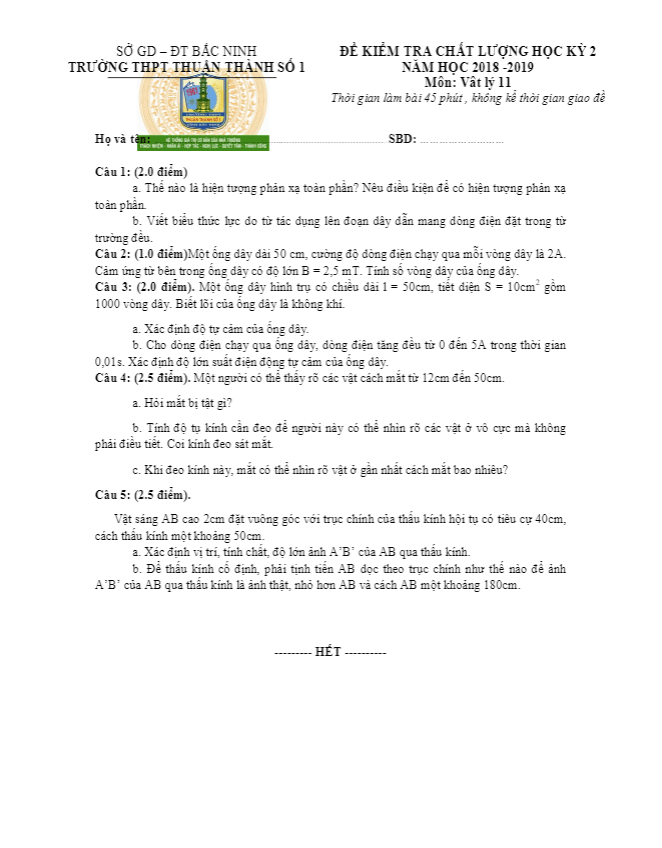 Đề thi HK2 Vật lý 11 năm 2018 – 2019 trường Thuận Thành 1 – Bắc Ninh