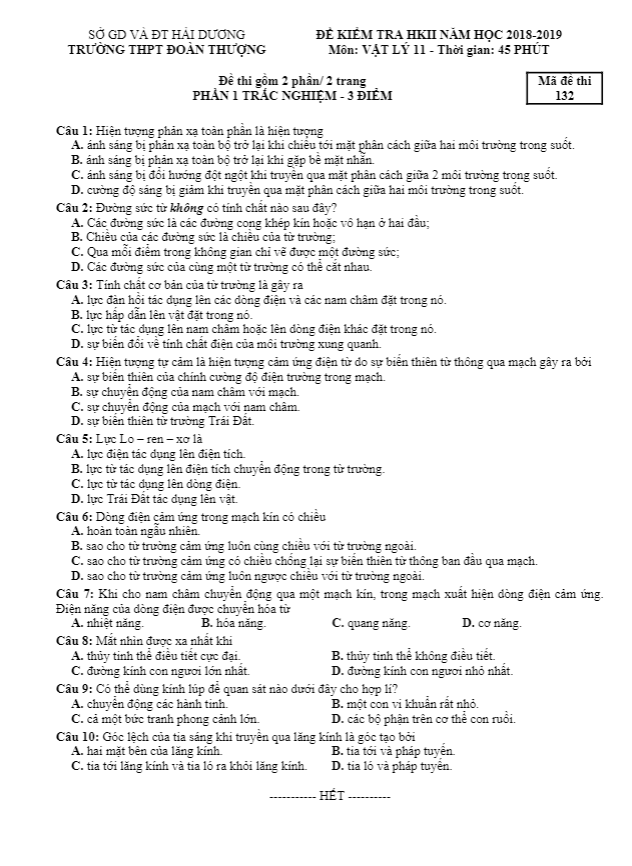 Đề thi học kì 2 Vật lí 11 năm 2018 – 2019 trường Đoàn Thượng – Hải Dương