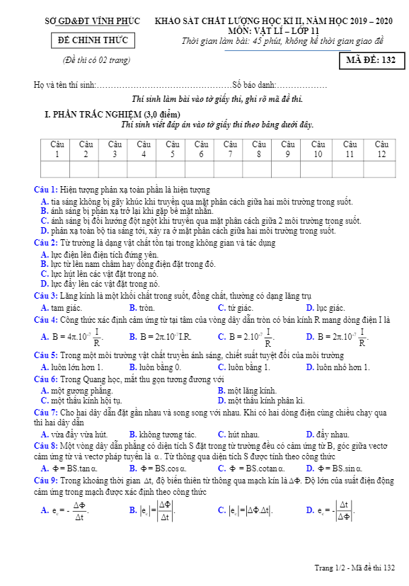 Đề thi học kì 2 Vật lí 11 năm học 2019 – 2020 sở GD&ĐT Vĩnh Phúc