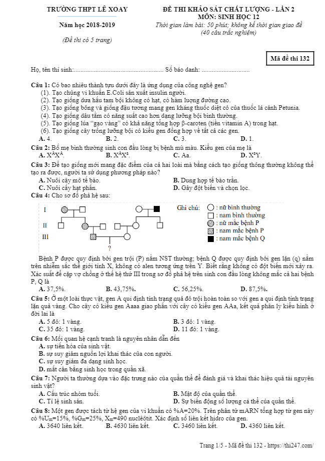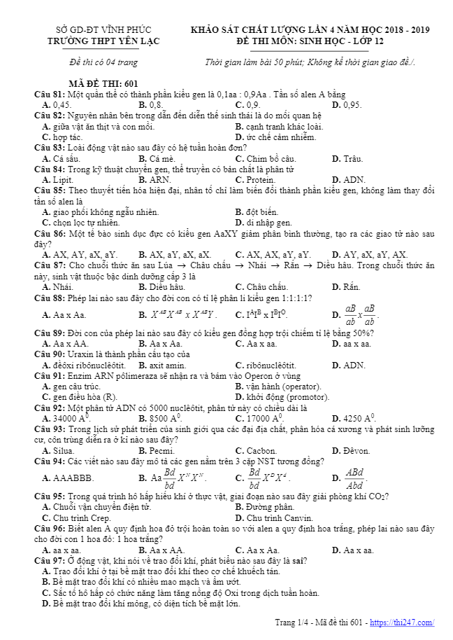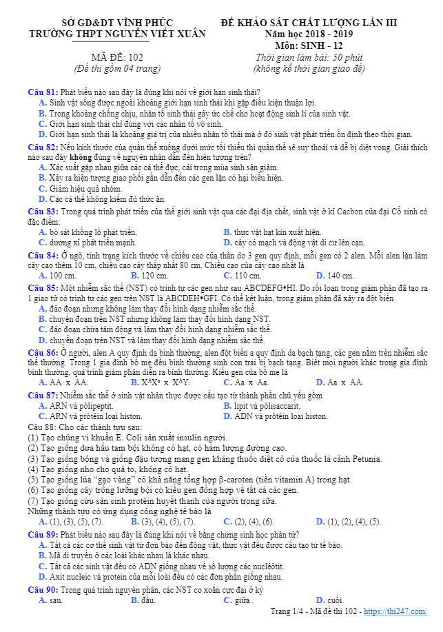 Quý thầy, cô giáo và các em học sinh có thể xem và tải xuống miễn phí các đề thi KSCL Sinh học 12 (khảo sát chất lượng Sinh học 12) được chia sẻ trên THI247.com.