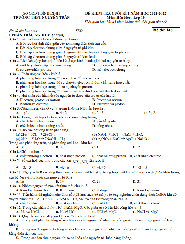 THI247.com sưu tầm và giới thiệu đến bạn đọc nội dung đề thi và bảng đáp án / hướng dẫn giải Đề cuối học kì 1 Hóa học 10 năm 2023 – 2024 trường THPT Bình Chiểu – TP HCM.