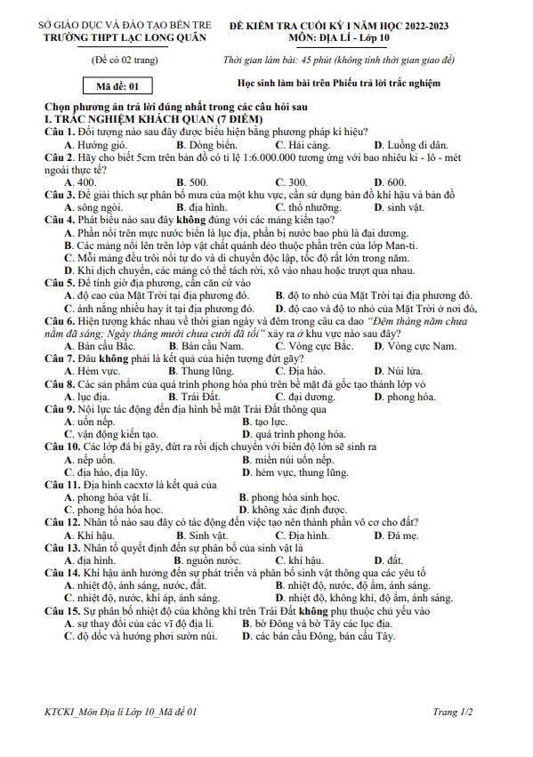 THI247.com sưu tầm và giới thiệu đến bạn đọc nội dung đề thi và bảng đáp án / hướng dẫn giải Đề cuối học kỳ 1 Địa lí 10 năm 2022 – 2023 trường THPT Lương Văn Can – TP HCM.