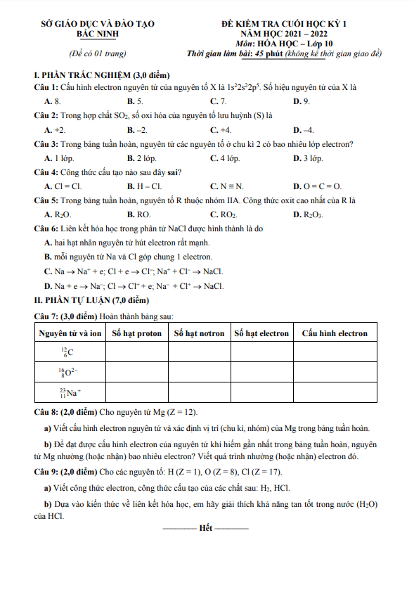 THI247.com sưu tầm và giới thiệu đến bạn đọc nội dung đề thi và bảng đáp án / hướng dẫn giải Đề cuối học kỳ 1 Hóa học 10 năm học 2023 – 2024 sở GD&ĐT Bắc Ninh.