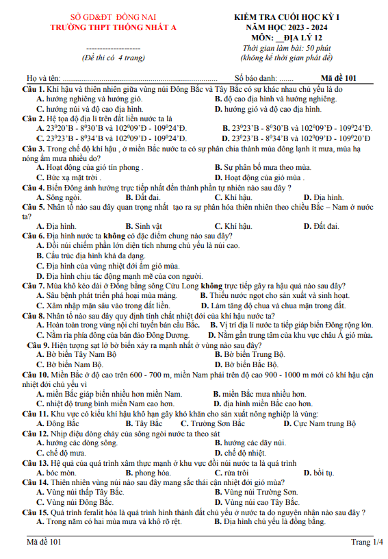 Câu 1: Biểu hiện rõ nhất của địa hình xâm thực ở miền núi nước ta là A. ngập úng. B. bồi tụ. C. lũ quét. D. đất trượt. Câu 2: Các nhóm đất chủ yếu của đai nhiệt đới gió mùa là A. đất mùn và đất mùn thô. B. đất feralit và đất feralit có mùn. C. đấtferalit có mùn và đất mùn. D. đất phù sa và đất feralit.
