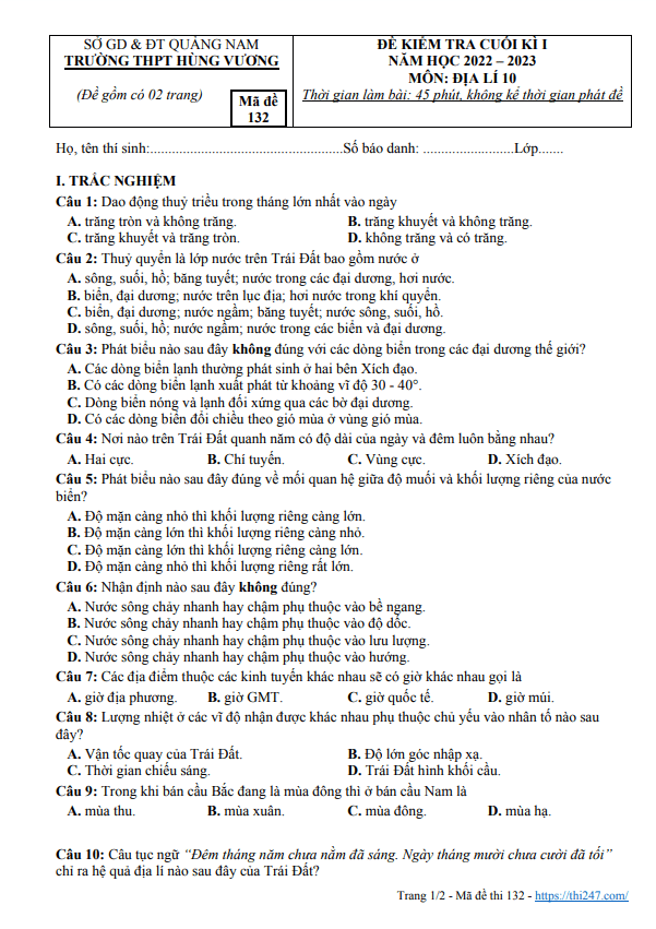 THI247.com sưu tầm và giới thiệu đến bạn đọc nội dung đề thi và bảng đáp án / hướng dẫn giải Đề cuối kỳ 1 Địa lí 10 năm 2023 – 2024 trường THPT Lê Lợi – Quảng Trị.