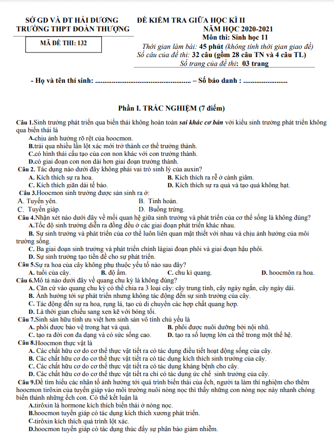 Đề giữa học kì 2 Sinh học 11 năm 2022 – 2023 trường THPT Dĩ An – Bình Dương