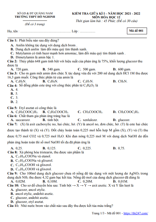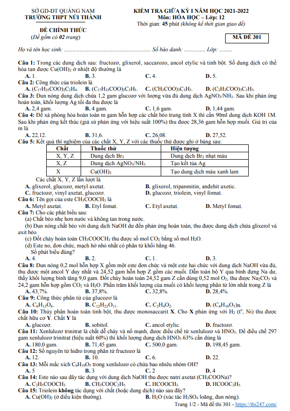 THI247.com giới thiệu đến bạn đọc nội dung đề thi và bảng đáp án / hướng dẫn giải đề giữa kì 1 Hóa học 12 năm 2022 – 2023 trường THPT Võ Nguyên Giáp – Quảng Nam.