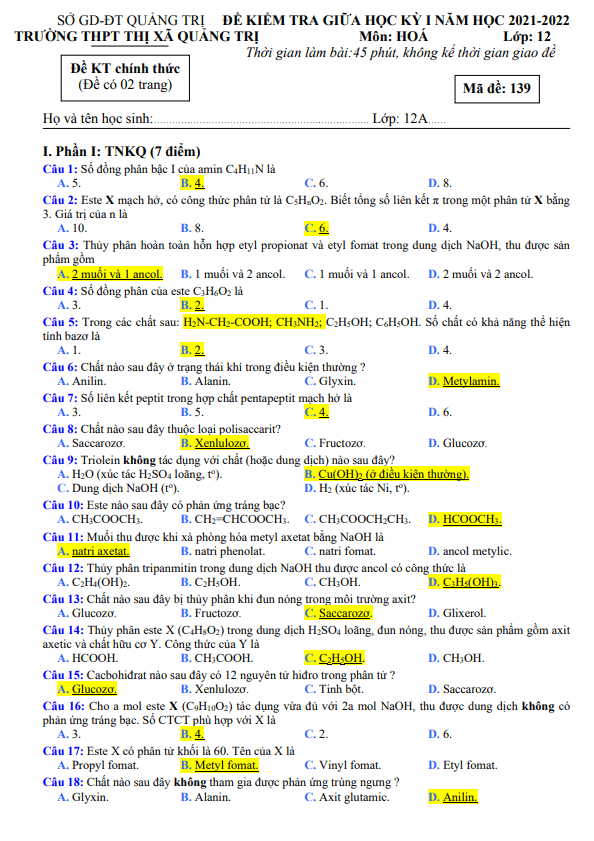 Câu 1. Mùi tanh của cá chủ yếu được gây nên bởi một số amin, nhiều nhất là trimetylamin. Để khử mùi tanh của cá trước khi chế biến, các đầu bếp thường dùng A. nước vôi. B. giấm ăn. C. nước muối. D. ancol etylic. Câu 2. Phát biểu nào dưới đây về tính chất vật lý của amin là sai? A. Các amin khí có mùi tương tự amoniac, độc. B. Độ tan của amin giảm dần khi số nguyên tử cacbon trong phân tử tăng. C. Metyl-, etyl-, dimetyl-, trimetylamin là những chất khí, dễ tan trong nước. D. Anilin là chất lỏng, khó tan trong nước, màu đen. Câu 3. Dung dịch chất nào sau đây làm quỳ tím chuyển thành màu xanh? A. Glucozơ. B. Axit axetic. C. Etylamin. D. Anilin. Câu 4. Từ 16,20 tấn xenlulozơ người ta sản xuất được m tấn xenlulozơ trinitrat (biết hiệu suất phản ứng tính theo xenlulozơ là 90%). Giá trị của m là A. 33,00. B. 25,46. C. 26,73. D. 29,70. Câu 5. Đun nóng dung dịch chứa 9 gam glucozơ với AgNO3 trong dung dịch NH3 (dư) thì khối lượng Ag tối đa thu được là A. 10,8 gam. B. 16,2 gam. C. 5,4 gam. D. 12,8 gam. Câu 6. Đốt cháy hoàn toàn 0,1mol este X thu được 0,4 mol CO2 và 0,4 mol H2O. Nếu cho 0,1 mol X tác dụng hết với NaOH thì thu được 8,2g muối. CTCT của X là A. CH3COOCH3. B. CH3COOC2H5. C. HCOOC3H7. D. C2H5COOCH3.