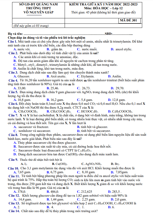 Câu 12. Khi xà phòng hoá tristearin ta thu được sản phẩm là A. C15H33COONa và glixerol. B. C17H35COOH và glixerol. C. C17H33COONa và glixerol. D. C17H35COONa và glixerol. Câu 13. Glucozơ là chất dinh dưỡng và được dùng làm thuốc tăng lực cho người già, trẻ em và người ốm. Số nguyên tử hidro trong phân tử glucozơ là A. 5. B. 12. C. 11. D. 6.