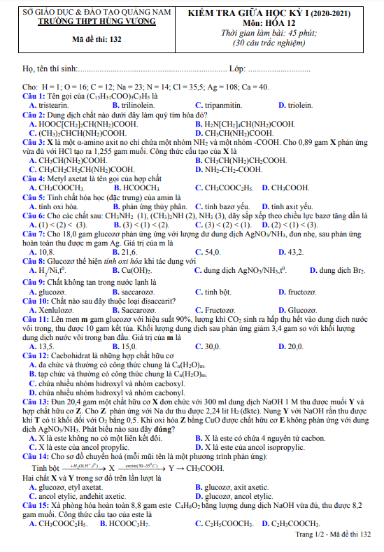 Câu 32: Chất X phản ứng với Na, thu ược khí H2. Từ X bằng phương pháp lên men sinh hóa, thu được giấm ăn. Tên gọi của X là A. Ancoletylic. B. Axit axetic. C. Ancol metylic. D. Axit fomic. Câu 33: Hợp chất X là 1 amin đơn chức bậc 1 chứa 31,11% nitơ. Công thức phân tử của X là: A. C4H7NH2. B. C2H5NH2. C. C3H5NH2. D. CH3NH2. Câu 34: Thủy phân chất nào sau đây trong dung dịch NaOH, thu được muối có công thức C15H31COONa? A. Propyl fomat. B. Vinyl axetat. C. Triolein. D. Tripanmitin.