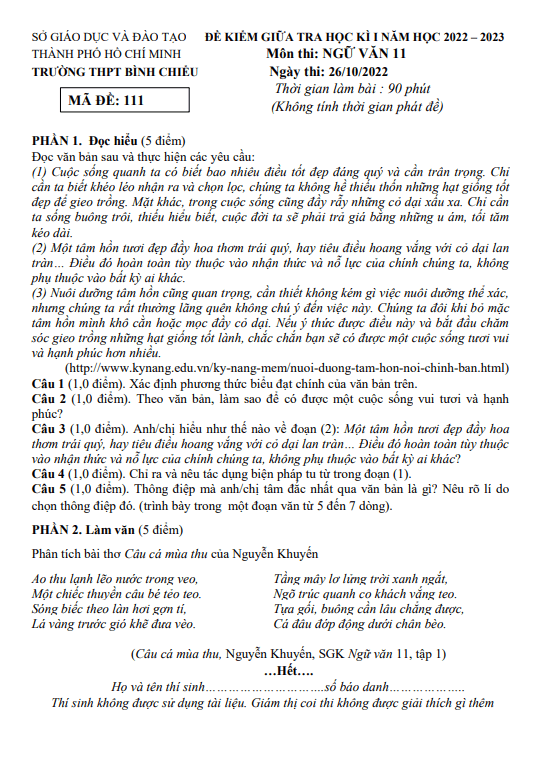 Đề giữa kì 1 Ngữ Văn 11 năm 2023 – 2024 trường THPT Phong Phú – TP HCM