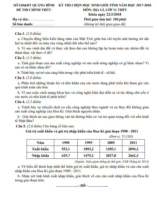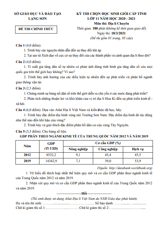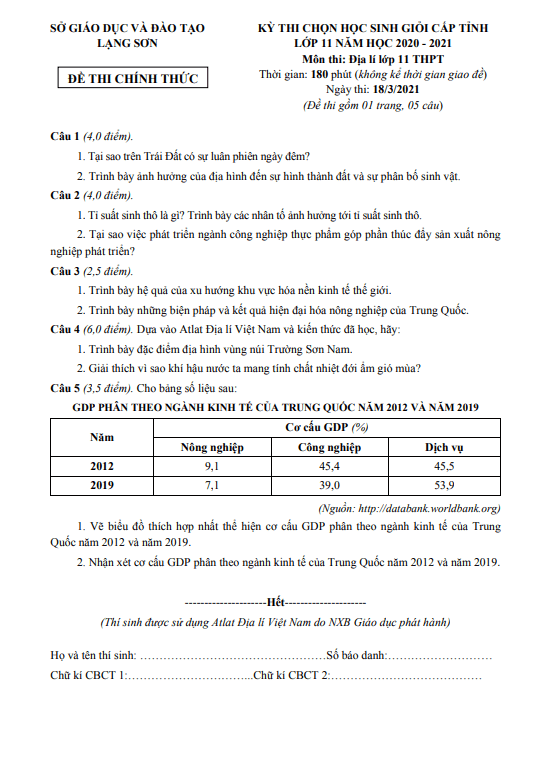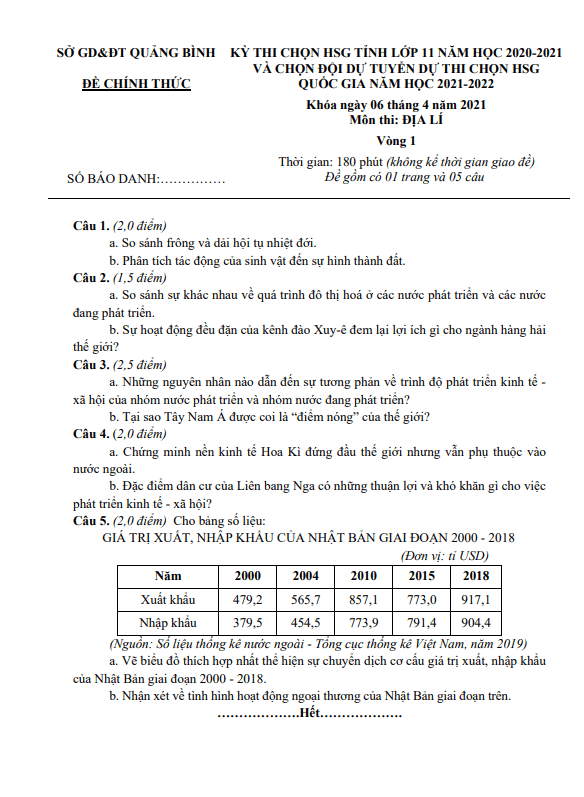 Câu 4. (4 điểm): a. Căn cứ vào bảng số liệu sau, nhận xét và giải thích tình hình phát triển ngành thủy sản nước ta, giai đoạn 2005 – 2021. SẢN LƯỢNG THỦY SẢN CỦA NƯỚC TA, GIAI ĐOẠN 2005 – 2021 (Đơn vị: Nghìn tấn). Phân tích vai trò của tuyến quốc lộ 1 và quốc lộ 5. Địa hình ảnh hưởng đến sự phát triển ngành giao thông vận tải đường ô tô của nước ta như thế nào? Câu 5. (4 điểm): Dựa vào Atlat Địa lí Việt Nam và kiến thức đã học, hãy: a. So sánh sự khác nhau về quy mô GDP, cơ cấu GDP phân theo khu vực kinh tế giữa vùng Đông Nam Bộ với vùng Duyên hải Nam Trung Bộ. b. Giải thích sự khác nhau về chuyên môn hóa sản xuất cây công nghiệp lâu năm giữa Tây Nguyên và Đông Nam Bộ. Vì sao việc hoàn thiện quy hoạch vùng chuyên canh cây công nghiệp lâu năm ở Tây Nguyên phải gắn với phát triển thủy lợi và bảo vệ rừng?