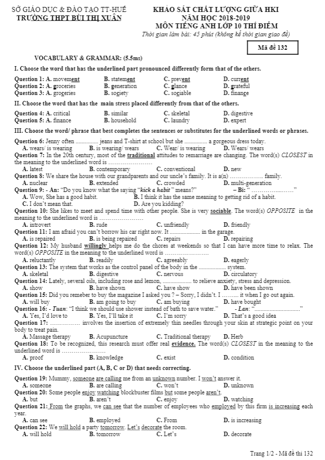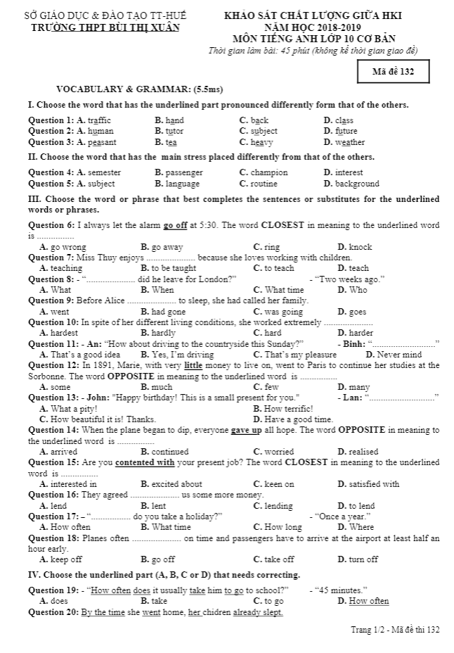 Các dạng câu hỏi trong đề kiểm tra chất lượng giữa HK1 Tiếng Anh 10 năm 2018 – 2019 trường Lý Thái Tổ – Bắc Ninh: