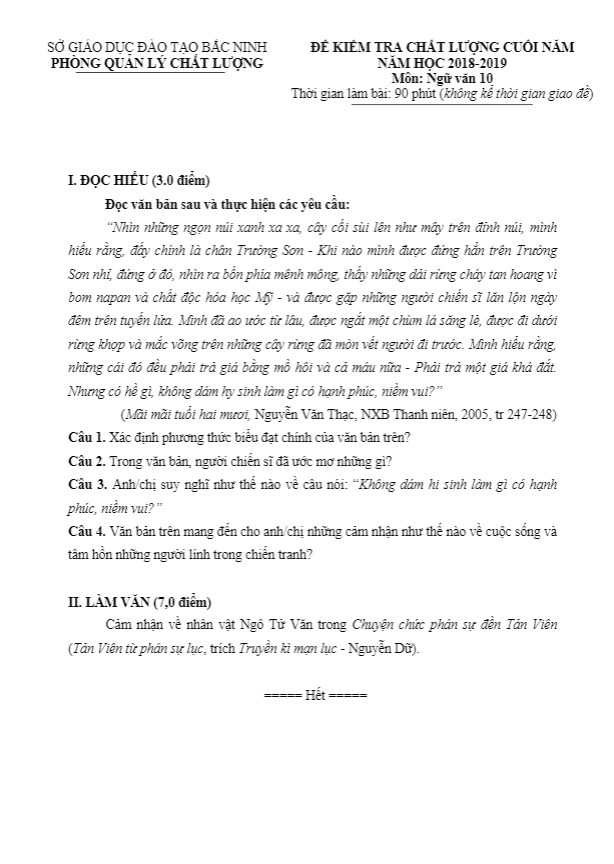 THI247.com sưu tầm và giới thiệu đến bạn đọc nội dung đề thi và bảng đáp án / hướng dẫn giải Đề kiểm tra cuối học kì 2 Ngữ Văn 10 năm 2023 – 2024 sở GD&ĐT Bắc Ninh.