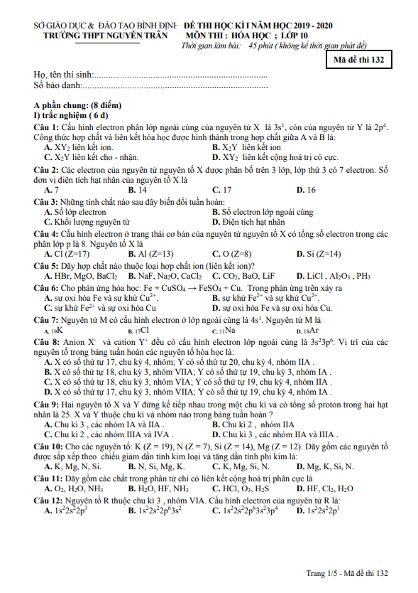 Câu 1. Liên kết ion là liên kết được tạo thành : A. Bởi lực hút tĩnh điện giữa các ion mang điện tích trái dấu B. Bởi cặp electron chung giữa 2 nguyên tử phi kim C. Bởi cặp electron chung giữa 1 nguyên tử kim loại và 1 nguyên tử phi kim D. Bởi cặp electron chung giữa 2 nguyên tử kim loại Câu 2. Liên kết cộng hóa trị là liên kết được hình thành giữa hai nguyên tử bằng A. một hay nhiều cặp electron chung. B. một cặp electron góp chung. C. sự cho−nhận proton. D. một electron chung. Câu 3. Phản ứng oxi hóa – khử là A. phản ứng hóa học trong đó có sự thay đổi số oxi hóa. B. phản ứng hóa học trong đó sự chuyển electron từ đơn chất sang hợp chất. C. phản ứng hóa học trong đó có sự chuyển proton. D. phản ứng hóa học trong đó phải có sự biến đổi hợp chất thành đơn chất. Câu 4. Hạt nhân của hầu hết các nguyên tử được cấu tạo từ các hạt là: A. Electron, proton và nơtron. B. Proton và nơtron. C. Nơtron và electron. D. Electron và proton.