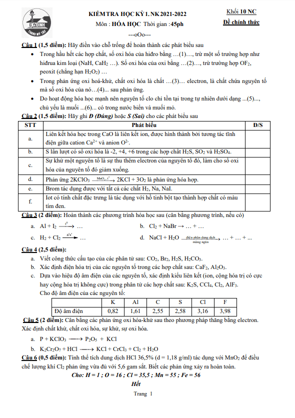 THI247.com giới thiệu đến bạn đọc nội dung đề thi + bảng đáp án / hướng dẫn giải đề kiểm tra cuối kì 1 Hóa học 10 năm 2021 – 2022 trường THPT Nguyễn Trân – Bình Định.
