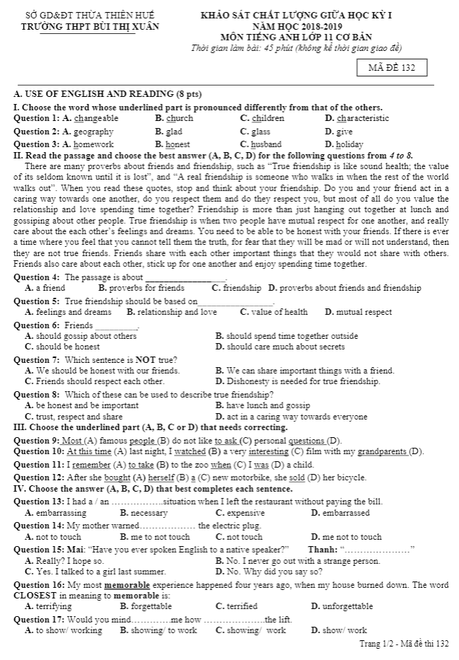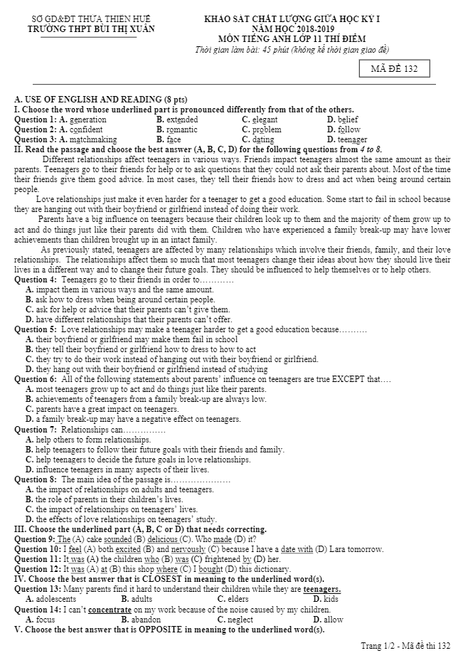 Trích dẫn đề kiểm tra giữa học kỳ 1 Tiếng Anh 11 năm 2018 – 2019 trường Lý Thái Tổ – Bắc Ninh:
