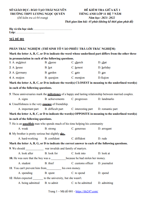 Đề kiểm tra giữa học kỳ 1 Tiếng Anh 11 năm 2018 – 2019 trường Lý Thái Tổ – Bắc Ninh mã đề 174 gồm 3 trang với 40 câu hỏi trắc nghiệm khách quan, yêu cầu học sinh làm bài trong vòng 50 phút (không tính thời gian giám thị phát đề), đề thi có đáp án toàn bộ các mã đề: 215, 409, 308, 174. THI247.com hy vọng thông qua việc tham khảo đề thi này, các em sẽ có thể hoàn thành tốt kỳ thi giữa học kỳ 1 Tiếng Anh 11 ở trường của mình, cũng như quý thầy, cô giáo đang giảng dạy môn Tiếng Anh 11 sẽ có thêm tư liệu để biên soạn đề thi.