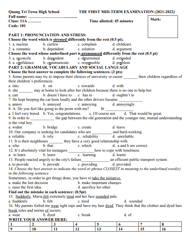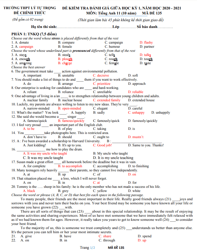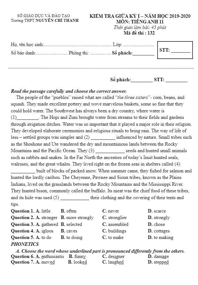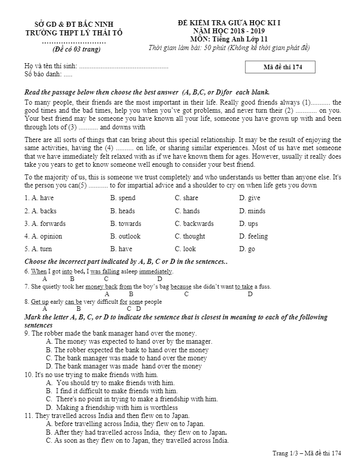 THI247.com giới thiệu đến bạn đọc nội dung đề thi + đáp án / đáp số + hướng dẫn làm bài đề kiểm tra giữa học kỳ 1 Tiếng Anh 11 năm học 2020 – 2021 sở GD&ĐT tỉnh Bắc Ninh.