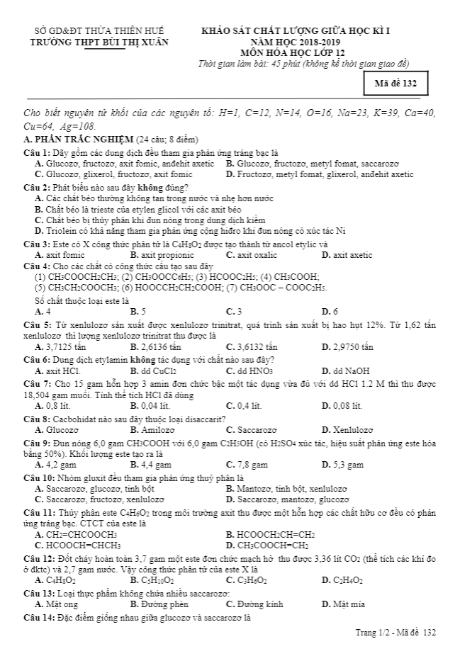 Đề kiểm tra giữa kỳ 1 Hóa học 12 năm 2018 – 2019 trường Quốc tế Á Châu – TP. HCM mã đề 132 gồm 2 phần thi, phần trắc nghiệm gồm 2 trang với 20 câu hỏi và bài tập, học sinh làm bài trong 25 phút, phần trắc nghiệm chiếm 50% tổng số điểm bài kiểm tra, phần tự luận gồm 1 trang với 5 câu hỏi và bài tập, học sinh làm bài trong 20 phút, phần tự luận chiếm 50% tổng số điểm bài kiểm tra, đề kiểm tra có đáp án và lời giải chi tiết.
