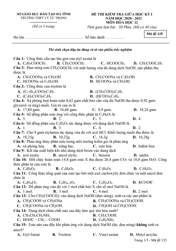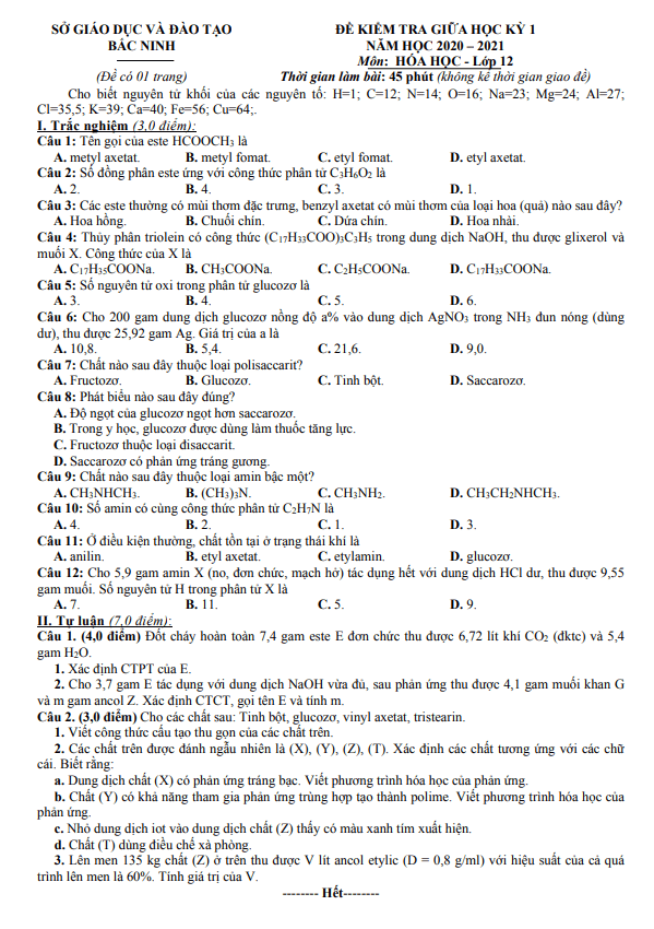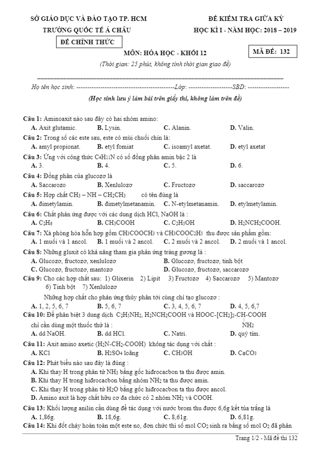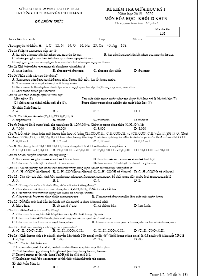 Cho: H = 1; O = 16; C = 12; Na = 23; N = 14; Cl = 35,5; Ag = 108; Ca = 40. Câu 1: Tên gọi của (C15H31COO)3C3H5 là A. tristearin. B. trilinolein. C. tripanmitin. D. triolein. Câu 2: Dung dịch chất nào dưới đây làm quý tím hóa đỏ? A. HOOC[CH2]2CH(NH2)COOH. B. H2N[CH2]4CH(NH2)COOH. C. (CH3)2CHCH(NH2)COOH. D. CH3CH(NH2)COOH. Câu 3: X là một α-amino axit no chỉ chứa một nhóm NH2 và một nhóm -COOH. Cho 0,89 gam X phản ứng vừa đủ với HCl tạo ra 1,255 gam muối. Công thức cấu tạo của X là A. CH3CH(NH2)COOH. B. CH3CH(NH2)CH2COOH. C. CH3CH2CH2CH(NH2)COOH. D. NH2-CH2-COOH. Câu 4: Metyl axetat là tên gọi của hợp chất A. CH3COOCH3. B. HCOOCH3. C. CH3COOC2H5. D. CH3COOH.