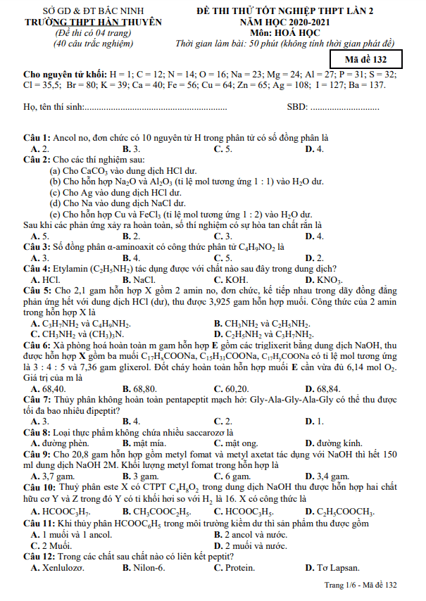 Đề kiểm tra Hóa học 12 đầu năm 2023 – 2024 trường THPT Hàn Thuyên – Bắc Ninh