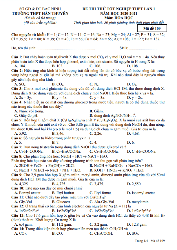 THI247.com chia sẻ đến bạn đọc đề kiểm tra lần 1 Hóa học 12 năm học 2019 – 2020 trường THPT Hàn Thuyên – Bắc Ninh, kỳ thi nhằm đánh giá chất lượng dạy và học môn Hóa học lớp 12 và nằm trong kế hoạch ôn tập để chuẩn bị cho kỳ thi THPT Quốc gia môn Hóa học năm học 2019 – 2020, đề thi có đáp án.