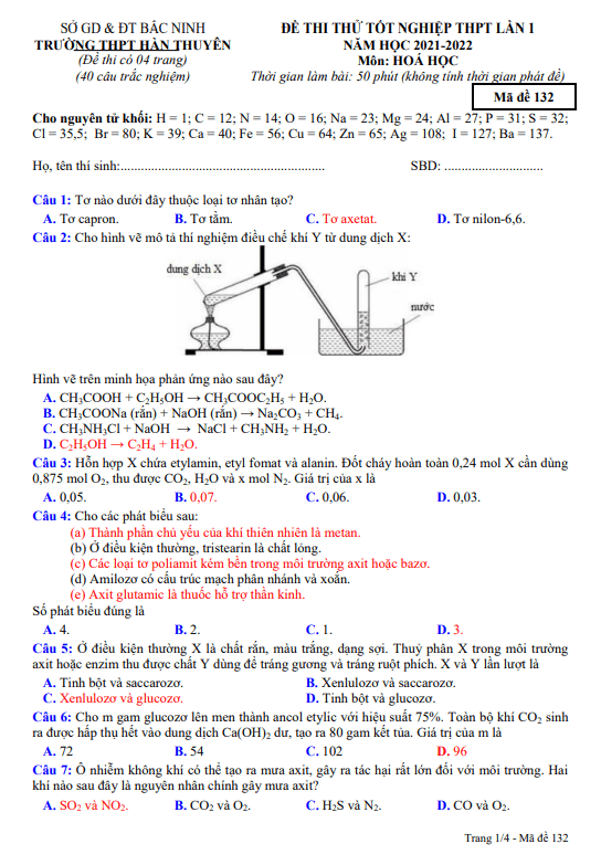 Trích dẫn đề kiểm tra lần 1 Hóa học 12 năm 2019 – 2020 trường Hàn Thuyên – Bắc Ninh: