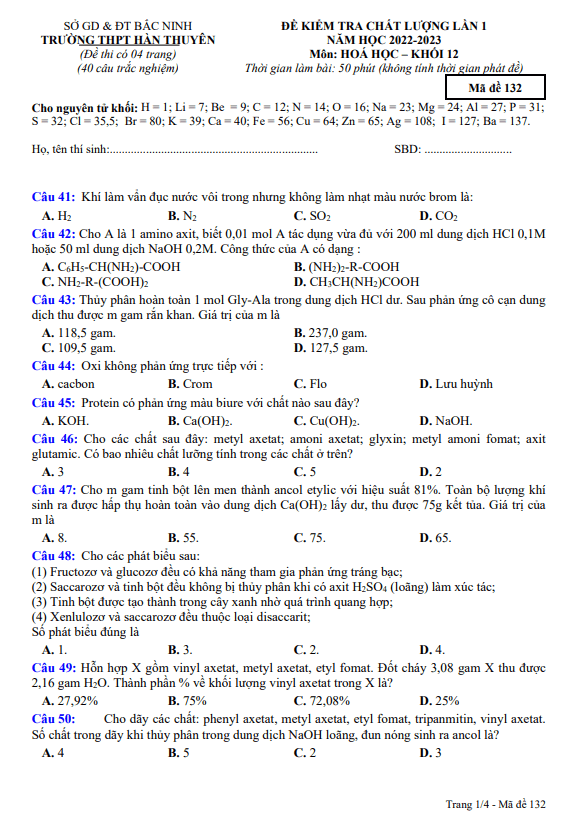 Đề kiểm tra lần 1 Hóa học 12 năm 2019 – 2020 trường Hàn Thuyên – Bắc Ninh