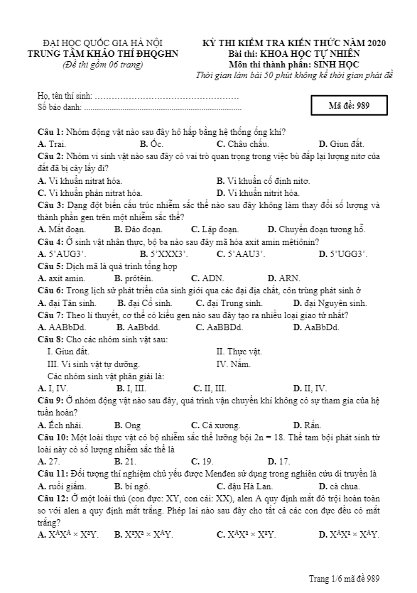 Đề kiểm tra Sinh học 12 lần 2 năm 2019 – 2020 trường THPT Lý Thường Kiệt – Bắc Ninh