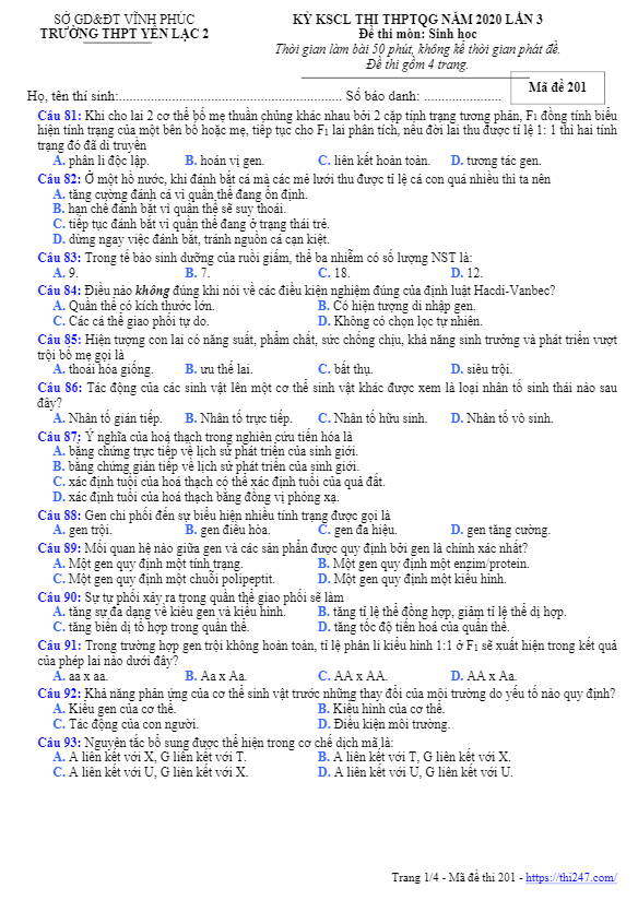 Câu 88: Khi nói về bằng chứng tiến hóa, có bao nhiêu nội dung sau đây đúng? I. Trong tiến hóa, các cơ quan tương tự có ý nghĩa phản ánh sự tiến hóa phân ly. II. Ở các loài sinh vật, protein đều được cấu trúc từ khoảng 20 loại aa khác nhau là bằng chứng sinh học phân tử. III. Bằng chứng tiến hóa có thể phân loại thành bằng chứng trực tiếp và bằng chứng gián tiếp. IV. Bằng chứng hóa thạch cho biết loài nào xuất hiện trước, loài nào xuất hiện sau. A. 3. B. 4. C. 1. D. 2. Câu 89: Bào quan thực hiện chức năng hô hấp ở thực vật là: A. Bộ máy gôngi. B. Ti thể. C. Không bào. D. Lục lạp. Câu 90: Phép lai nào sau đây là phép lai phân tích? A. aaBB x aaBb. B. AaBb x Aabb. C. AaBb x aaBb. D. AAbb x aabb. Câu 91: Trong lịch sử phát triển của sinh giới qua các đại địa chất, loài người phát sinh ở đại A. Cổ sinh. B. Tân sinh. C. Nguyên sinh. D. Thái cổ.