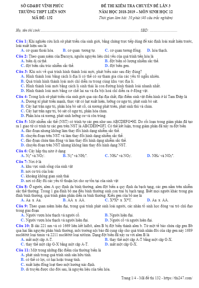 Câu 88: Trong tế bào nhân thực, loại axit nucleic nào sau đây có cấu tạo 1 mạch đơn dạng thẳng và không có cặp nucleotit bổ sung? A. tARN. B. mARN. C. ADN. D. rARN. Câu 89: Để phát hiện vị trí của một gen quy định tính trạng nằm trên NST thường, trên NST giới tính hay trong tế bào chất, người ta dùng phương pháp nào sauđây? A. Giao phối cận huyết ở động vật. B. Tự thụ phấn ở thực vật. C. Lai thuận nghịch. D. Lai phân tích. Câu 90: Phát biểu nào sau đây về đột biến gen là sai? A. Đột biến gen làm xuất hiện các alen khác nhau cung cấp nguyên liệu cho quá trình tiến hoá. B. Đột biến thay thế một cặp nuclêôtit luôn làm thay đổi chức năng của prôtêin. C. Mức độ gây hại của alen đột biến phụ thuộc vào điều kiện môi trường và tổ hợp gen. D. Đột biến gen có thể có hại, có lợi hoặc trung tính đối với thể đột biến
