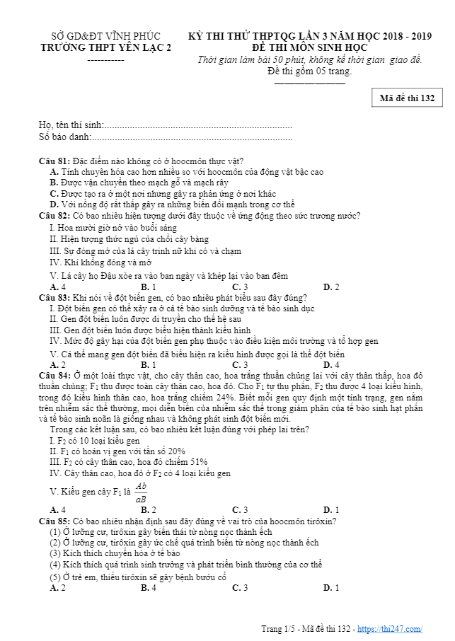 Trích dẫn đề KSCL Sinh học THPTQG 2020 lần 2 trường THPT Đồng Đậu – Vĩnh Phúc: