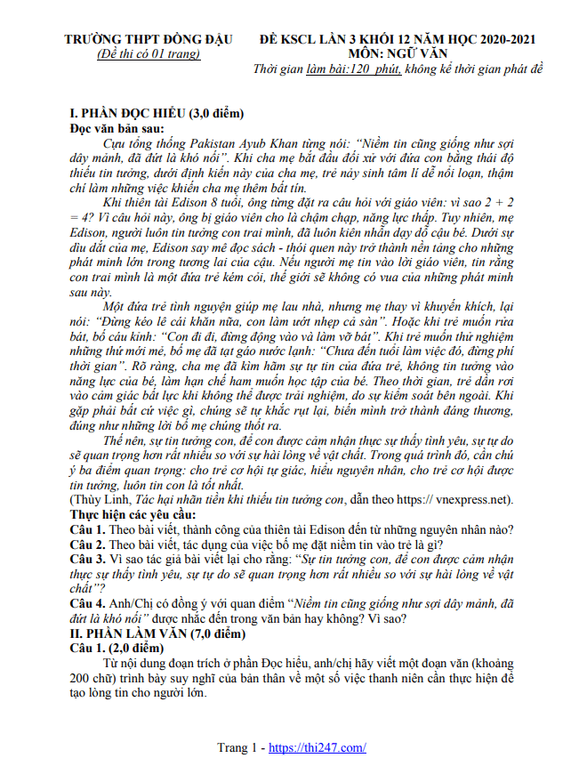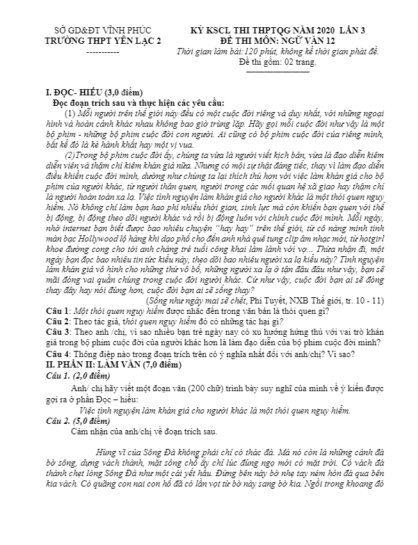 Nhằm đáp ứng đồng thời hai yêu cầu: (1) – kiểm tra chất lượng môn Ngữ Văn 12 giai đoạn giữa học kỳ 1 và (2) – kiểm tra toàn diện kiến thức Ngữ Văn trong quá trình chuẩn bị cho kỳ thi THPT Quốc gia 2020 môn Ngữ Văn, trường THPT Đồng Đậu, tỉnh Vĩnh Phúc đã tổ chức kỳ thi khảo sát chất lượng Trung học Phổ thông Quốc gia môn Ngữ Văn lần 1 năm học 2019 – 2020.