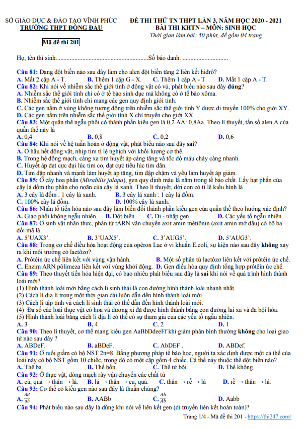 Nhằm đáp ứng đồng thời hai yêu cầu: (1) – kiểm tra chất lượng môn Sinh học 12 giai đoạn giữa học kỳ 1 và (2) – kiểm tra toàn diện kiến thức Sinh học trong quá trình chuẩn bị cho kỳ thi THPT Quốc gia 2020 môn Sinh học, trường THPT Đồng Đậu, tỉnh Vĩnh Phúc đã tổ chức kỳ thi khảo sát chất lượng Trung học Phổ thông Quốc gia môn Sinh học lần 1 năm học 2019 – 2020.