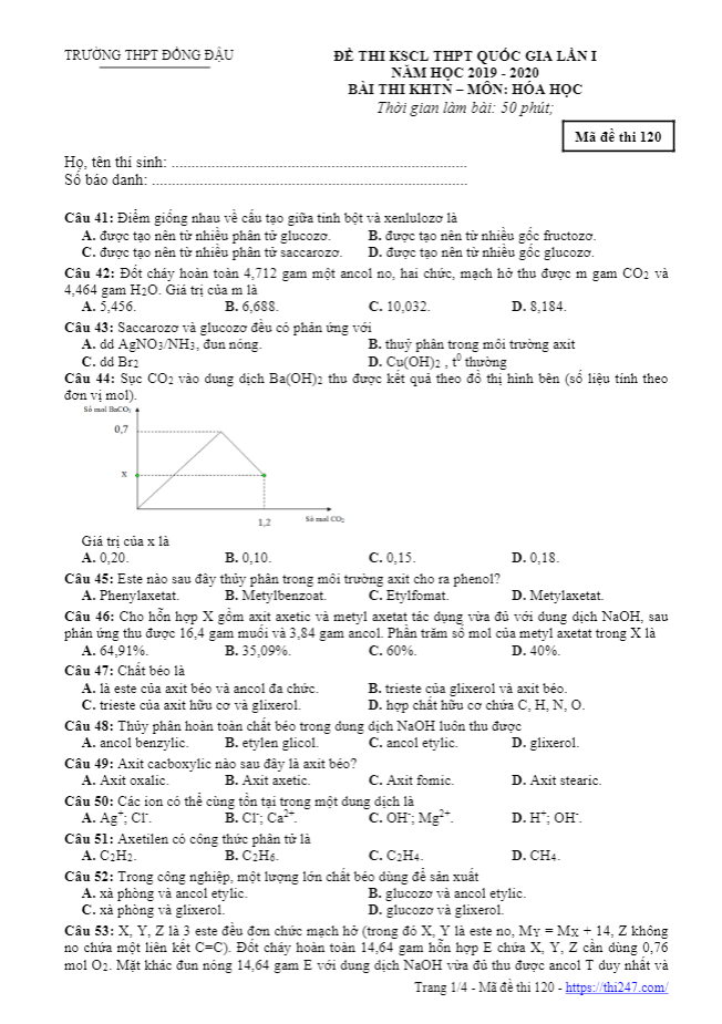 THI247.com giới thiệu đến quý thầy, cô giáo giảng dạy môn Hóa học cùng các em học sinh khối 12 đề KSCL THPT Quốc gia môn Hóa học năm 2018 – 2019 trường Đồng Đậu – Vĩnh Phúc lần 1, đề có mã đề 121 gồm 4 trang với 40 câu trắc nghiệm khách quan, học sinh có 50 phút để hoàn thành đề thi này, kỳ thi được diễn ra trong giai đoạn giữa học kỳ 1, đây là thời điểm khá sớm để tổ chức thi thử môn Hóa học, tuy nhiên lại phù hợp với tình hình thi THPT Quốc gia môn Hóa học hiện nay, khi mà hình thức cũng như cấu trúc đề được thử nghiệm và thay đổi liên tục, do đó việc thi thử Hóa học 2019 càng sớm càng tốt, giúp học sinh nhanh chóng nắm bắt những thay đổi đó để có kế hoạch ôn tập phù hợp, đề thi thử Hóa học có đáp án giúp các em có thể kiểm tra lại kết quả sau khi thử sức với đề.
