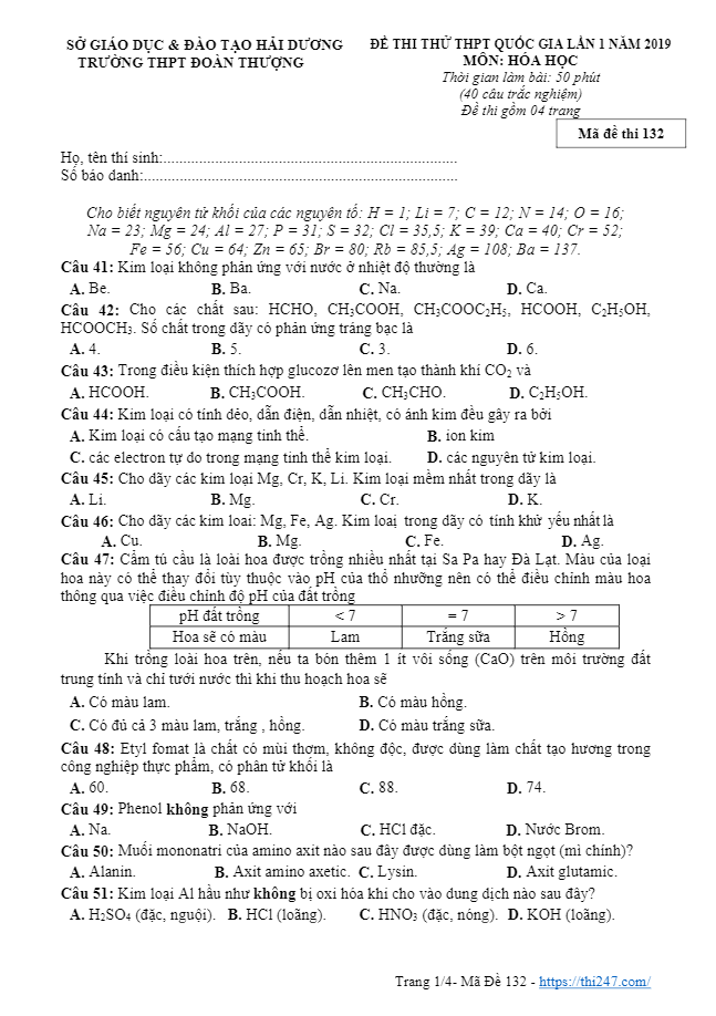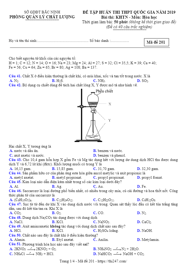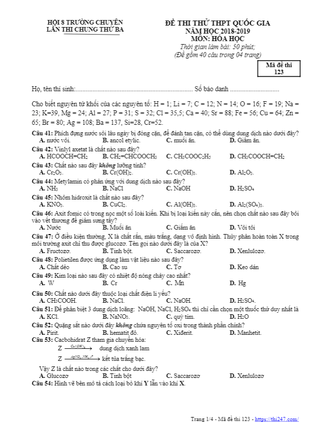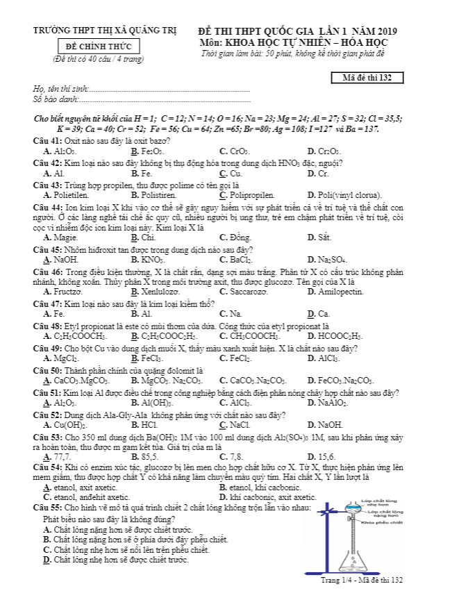 Đề minh họa Hóa học kỳ thi THPT Quốc gia 2019 của Bộ Giáo dục và Đào tạo có mã đề 001 gồm 4 trang được biên soạn theo hình thức trắc nghiệm khách quan với 40 câu hỏi và bài tập, thời gian làm bài 90 phút (không tính thời gian phát đề).